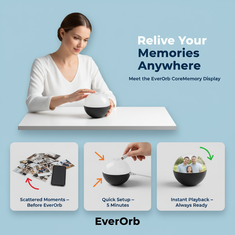 Plug in your USB, press play, and watch your favorite moments come to life. EverOrb’s 360° sphere makes every memory feel brand new.
